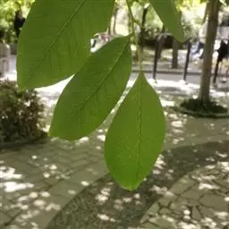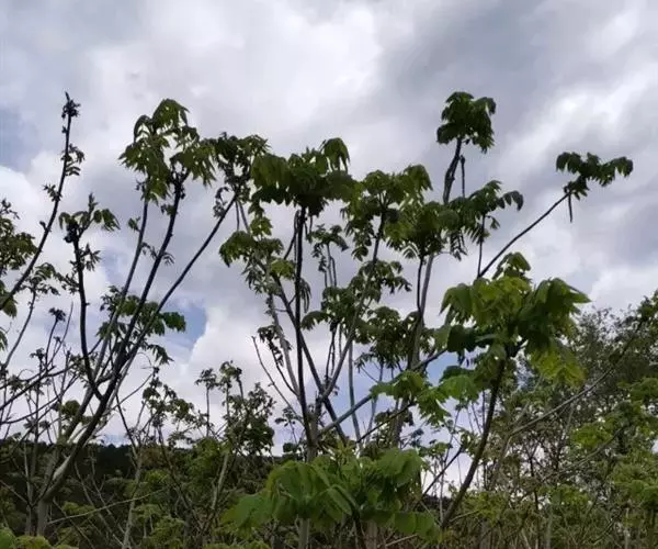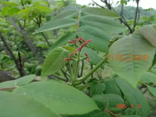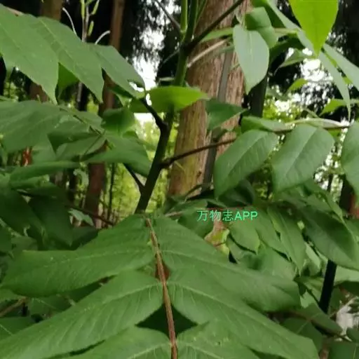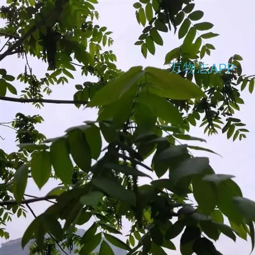 奇数羽状复叶生于萌发条上者长可达80厘米,叶柄长9-14厘米,小叶15-23枚,长6-17厘米,宽2-7厘米;生于孕性枝上者集生于枝端,长达40-50厘米,叶柄长5-9厘米,基部膨大,叶柄及叶轴被有短柔毛或星芒状毛;小叶9-17枚,椭圆形至长椭圆形或卵状椭圆形至长椭圆状披针形,边缘具细锯齿,上面初被有稀疏短柔毛,后来除中脉外其余无毛,深绿色,下面色淡,被贴伏的短柔毛及星芒状毛;侧生小叶对生,无柄,先端渐尖,基部歪斜,截形至近于心脏形;顶生小叶基部楔形。