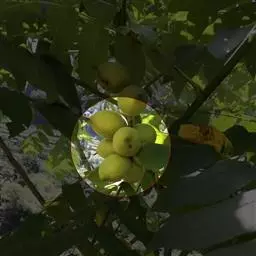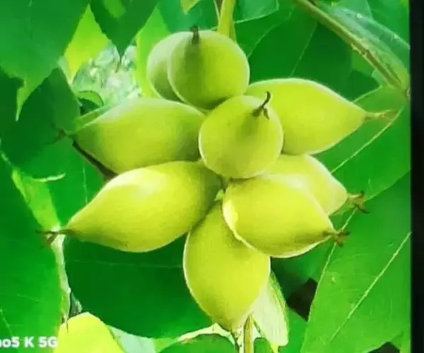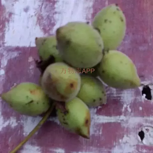 果序长约10-15厘米,俯垂,通常具5-7果实,序轴被短柔毛。果实球状、卵状或椭圆状,顶端尖,密被腺质短柔毛,长3.5-7.5厘米,径3-5厘米;果核长2.5-5厘米,表面具8条纵棱,其中两条较显著,各棱间具不规则皱曲及凹穴,顶端具尖头;内果皮壁内具多数不规则空隙,隔膜内亦具2空隙。花期5月,果期8-9月。