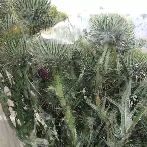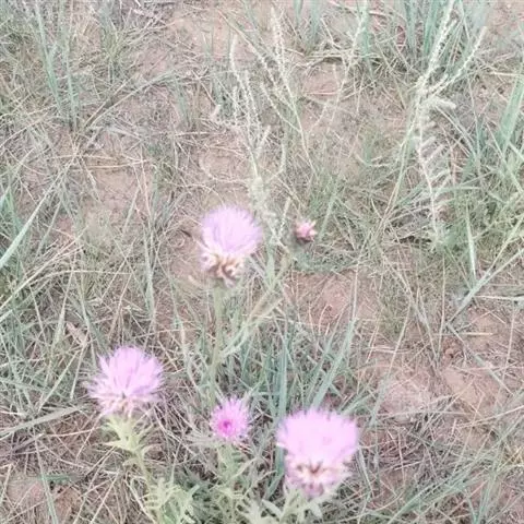 头状花序多数或少数在茎枝顶端排成不明显或不规则的伞房花序,少有植株含有1个头状花序而单生茎顶的。总苞卵形或球形,直径达5厘米,幼时被蛛丝毛,后变无毛。总苞片多层,外层与中层质地坚硬,革质,卵状钻形或披针状钻形,长1.7-1.8厘米,上部钻状针刺状长渐尖,向外反折或水平伸出;内层披针状钻形或线钻形,长2.5-3厘米,上部钻状长渐尖。全部苞片边缘短缘毛,外面有腺点。小花紫红色或粉红色,花冠2.4厘米,檐部长1.2厘米,5裂至中部,裂片狭线形,细管部长1.2厘米。