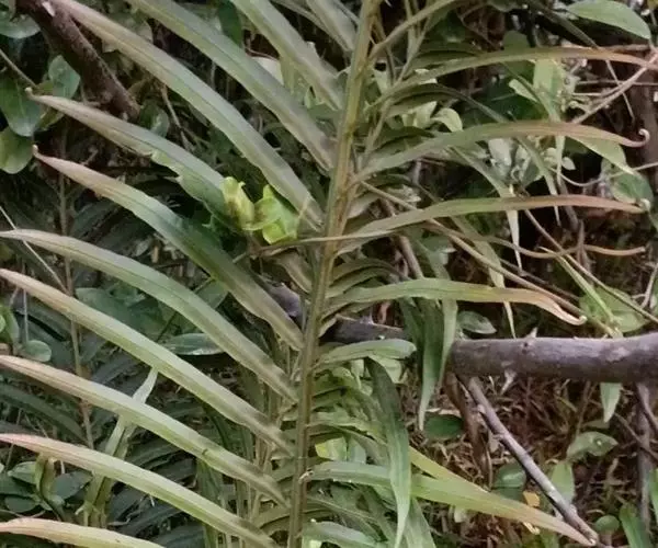 叶簇生于根状茎顶端;柄长3-80厘米,粗3-10毫米,坚硬,基部往往为黑褐色,向上为棕禾秆色或棕绿色,无毛;叶片卵状披针形,长达1米左右,宽20-60厘米,一回羽状;羽片多数,二形,互生,无柄,下部羽片不育,极度缩小为圆耳形,长仅数毫米,彼此远离,向上羽片突然伸长,疏离,能育,至中上部羽片最长,斜展,线形或线状披针形,长10-30厘米,宽5-18毫米,先端长渐尖或尾状渐尖,基部圆楔形,下侧往往与叶轴合生,全缘或呈微波状,干后反卷,上部羽片向上逐渐缩短,基部与叶轴合生并沿叶轴下延,顶生羽片与其下的侧生羽片同形,但长于其下的侧生羽片。