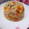 2.将锅放在大火上,内加入猪油烧制五成熟,放入葱花、姜爆香,然后将辅料中的鸡丁、瘦猪肉、虾仁、熟火腿丁、香菇丁分别到入锅中炒熟。出锅后放凉备用;