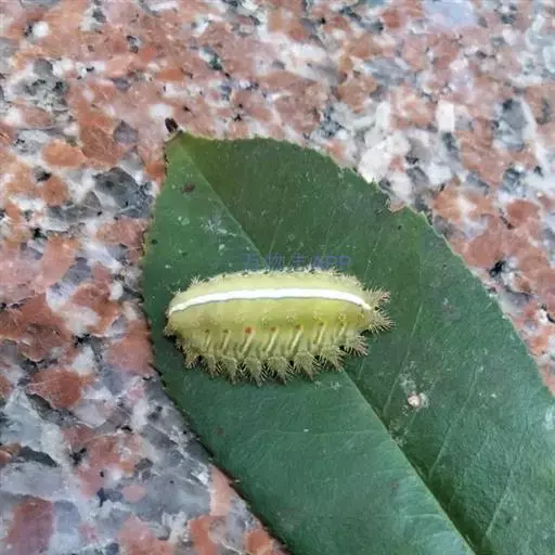 老熟幼虫体长21--26毫米,宽16毫米,体扁、椭圆形,背部稍隆起,形似龟背。全体绿色或黄绿色,背线白色。体两侧各有10个瘤状突起,其上生有刺毛,每一体节的背面有2小丛刺毛,第四节背面两侧各有一红点。