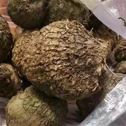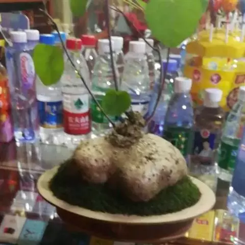 块根厚大,扁圆形,外皮粗糙,灰褐色,叶互生,具长柄,盾状着生,叶片近圆形,全缘,掌状脉7~9条,两面无毛,下面灰白色。花雌雄异株,暗红色,复伞花序腋生,花柄与叶柄近等长,核果圆形,熟时红色。主要