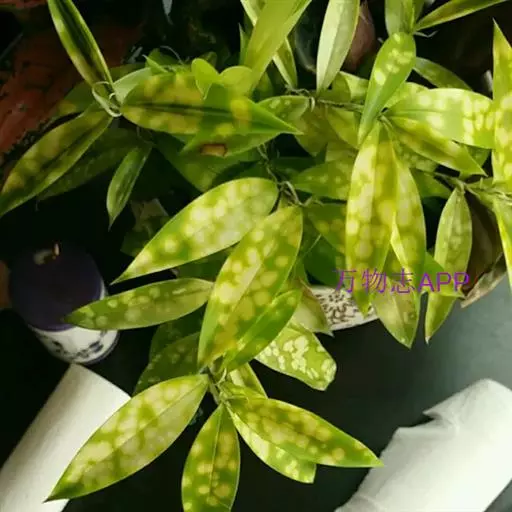 单叶对生或三叶轮生,长椭圆形,浓绿色或橄榄色,叶面上布满乳白色或黄色的小斑点。花黄绿色,花期5月。