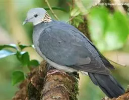 原鸽头、颈、胸和上背等均暗石板灰色,颈、上胸、上背、翕具金属紫绿色光泽,下背和腰灰白色或浅蓝灰色,翅上覆羽亦为浅蓝灰色,中覆羽和大覆羽各横贯以一道不完整的黑斑,飞羽浓褐色。尾上覆羽及尾羽暗灰色,具宽阔的黑色亚端斑。下体石板灰色或浅蓝灰色,胸和尾下覆羽较深;翅下覆羽和腋羽白色。