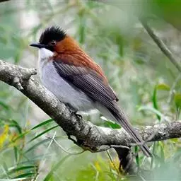 栗背短脚鹎,体长18-22厘米。上体栗褐,头顶和羽冠黑色。背栗色、翅和尾暗褐色具白色或灰白色羽缘。…