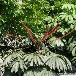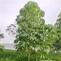 常绿乔木,高可达30~40米。茎杆直立,干光滑,少分枝,初生嫩枝绿色,后呈褐色,平滑,逐渐木质化。叶为掌状复叶,革质,长20~30厘米,宽10厘米,叶面浓绿色。有光泽,叶背淡绿色。叶柄红褐色,长5~10厘米。长椭圆形,先端钝。小叶数随树木的年龄而异,幼年时3~5片,长大时9~12片,至乔木状时可多达16片。花为圆锥状花序,花小型。浆果,圆球形,熟时紫红色。