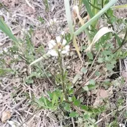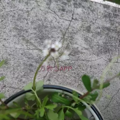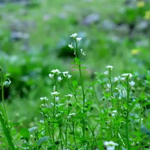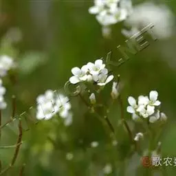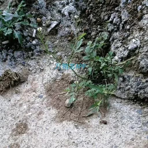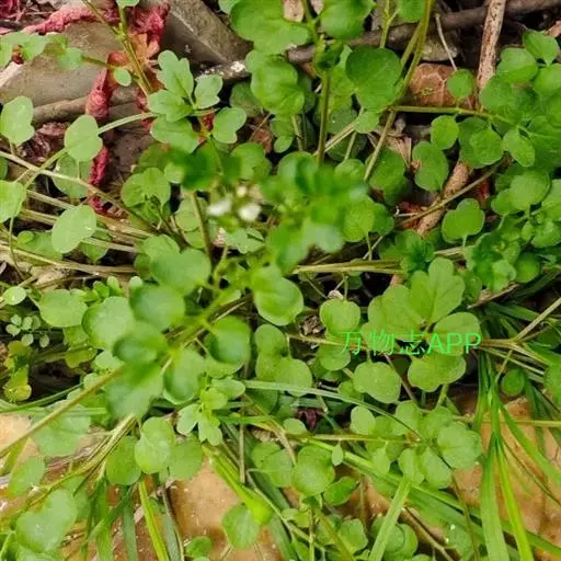 碎米荠(Cardamine hirsuta L. ):为罂粟目、十字花科、碎米荠属一年生小草本,高15-35厘米。茎直立或斜升,下部有时淡紫色,上部毛渐少。基生叶具叶柄,顶生小叶肾形或肾圆形;茎生叶具短柄;全部小叶两面稍有毛。总状花序生于枝顶,花小,花梗纤细;萼片绿色或淡紫色,长椭圆形,外面有疏毛;花瓣白色,倒卵形。长角果线形,稍扁,无毛;果梗纤细,直立开展。种子椭圆形,顶端有的具明显的翅。花期2-4月,果期4-6月。