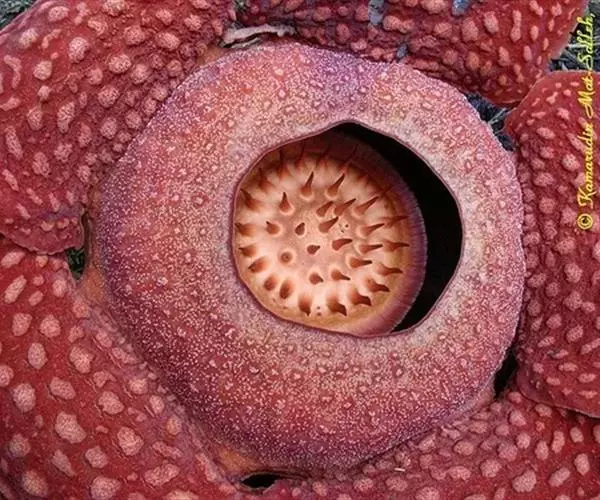 种子的丝状芽体可在不伤害宿主的情况下逐渐在茎皮内蔓延,直至一年半后,种子吸收了足够的能量,体积膨大,穿破种皮萌发出约6毫米的芽点。经过几个月的缓慢生长,花蕾逐渐由乒乓球般的体积直至生长到甘蓝一般大小。等过了一个月,花苞便会缓缓张开,完全绽放需要两天两夜。盛开的大王花艳丽多彩,整个花冠呈鲜红色,上面有点点白斑,花冠 50-90厘米,5片多浆汁的花瓣厚而坚韧,每片花瓣厚约5厘米,宽 30厘米左右,花瓣质量总重最高可达 10千克之多。花朵中央有一个圆口大蜜槽,其容积相当大,能够承起5-7千克水。