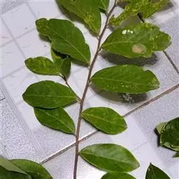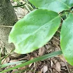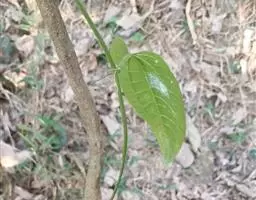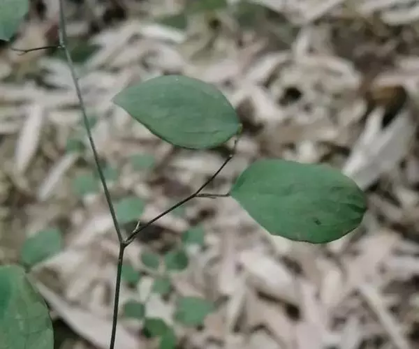 叶纸质,卵形、卵状披针形或近圆形,长1.5-4(-6)厘米,宽1.2-3.5(-5)厘米,下面稍苍白色或有时有粉尘状物;叶柄长5-12毫米,向基部渐宽成鞘状,背面有多条纵槽,无卷须,脱落点位于近顶端。