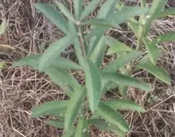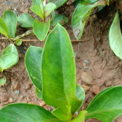 叶对生,卵状披针形,长4-10厘米,宽1.2-3.2厘米,先端长渐尖或近尾状,基部圆形,无柄或近于无柄,上面绿色,下面粉绿色,两面均有暗紫色或黑色腺点及短腺条,沿边缘尤密,中肋在上面稍隆起,侧脉纤细,4-5对,网脉不明显。