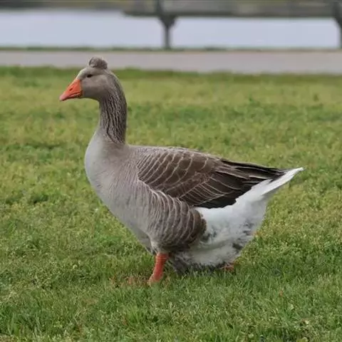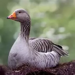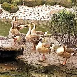 狮头鹅 羽毛灰褐色或银灰色,腹部羽毛白色。头大而眼小,头部顶端和两侧具有较大黑肉瘤,鹅的肉瘤可随年龄而增大,形似狮头,故称狮头鹅。颔下肉垂较大。嘴短而宽,颈长短适中,胸腹宽深,脚和蹼为橙黄色或黄灰色,成年公鹅体重10-12公斤,母鹅9-10公斤。生长迅速,体质强健。成熟早,肌肉丰厚,肉质优良。但年产卵量少,仅有25-35个,每个卵重平均约有203克左右。极耐粗饲,食量大。75-90日龄的肉用鹅,体重为5-7.5公斤。行动迟钝,觅食能力较差。有就巢性,现已向全国各地推广。