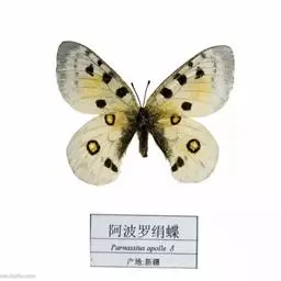阿波罗绢蝶:翅展约7-8.4厘米。前翅较圆,白垩色,翅表有许多黑点、灰白斑及无鳞透明区,…