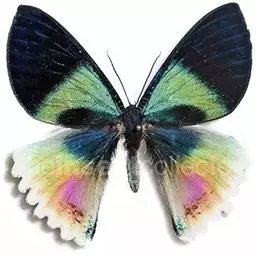 天堂凤蝶翅展可达105mm。前、后翅自基角至后缘约1/2~2/3端为纯净的宝蓝色,后角至后缘1/3…