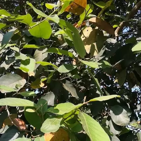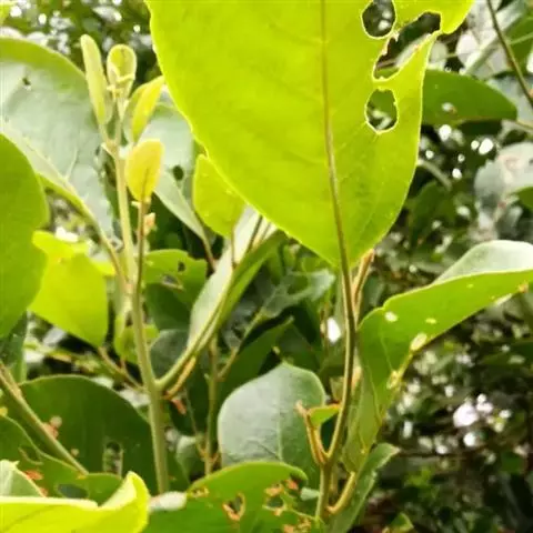 常绿小乔木或乔木,高3-15米;树皮灰色或灰褐色,内皮有粘质。小枝灰褐色,幼时有灰黄色绒毛。顶芽卵圆形,鳞片外面被灰黄色绒毛。叶互生,倒卵形、倒卵状长圆形或椭圆状披针形,长6.5-10(26)厘米,宽5-11厘米,先端钝或圆,基部楔形,钝或近圆,革质,幼时两面均有毛,老时上面仅中脉略有毛,下面有灰黄色绒毛或近于无毛,羽状脉,侧脉每边8-12条,直展,中、侧脉在叶上面微突,在下面突起;叶柄长1-2.6厘米,有灰黄色绒毛。