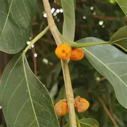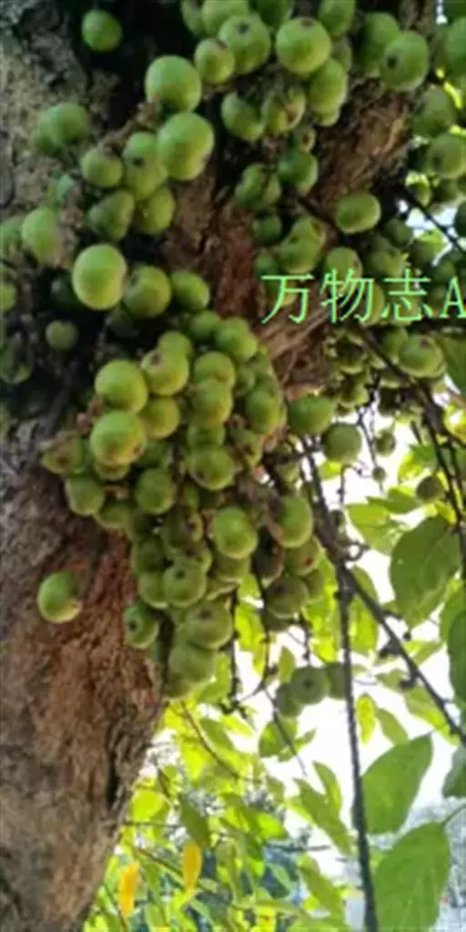 榕果聚生于老茎瘤状短枝上,稀成对生于落叶枝叶腋,梨形,直径2-2.5厘米,顶部脐状,压平,基部缢缩成柄,基生苞片3,三角状卵形,总梗长约1厘米;雄花生于榕果内壁近口部,无柄,花被片3-4,雄蕊2;瘿花和雌花有柄,花被线形,先端有3-4齿,花柱侧生,柱头棒状。成熟榕果橙红色。花期5-7月。