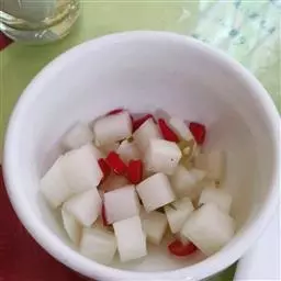 2.鸡肉洗净,切小块放入容器中,加1汤勺料酒、白胡椒粉、姜片、蒜拌匀,腌制20分钟。