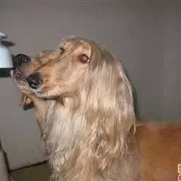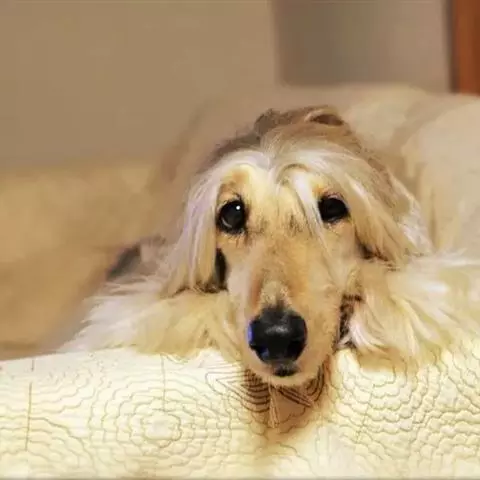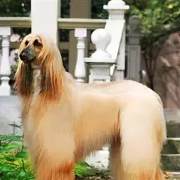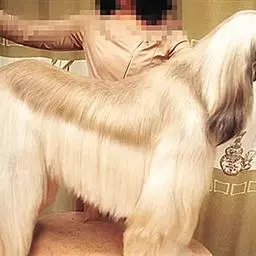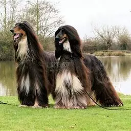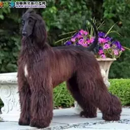阿富汗猎犬全身披丝绢状的长毛,毛色鲜艳,呈多种颜色,背中线附近毛短,…