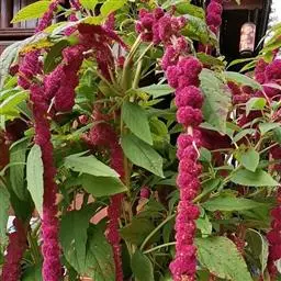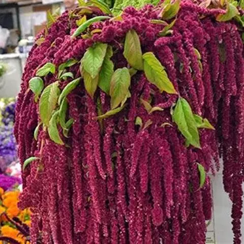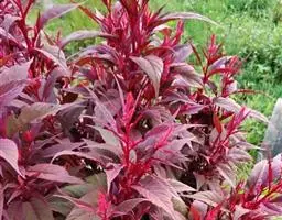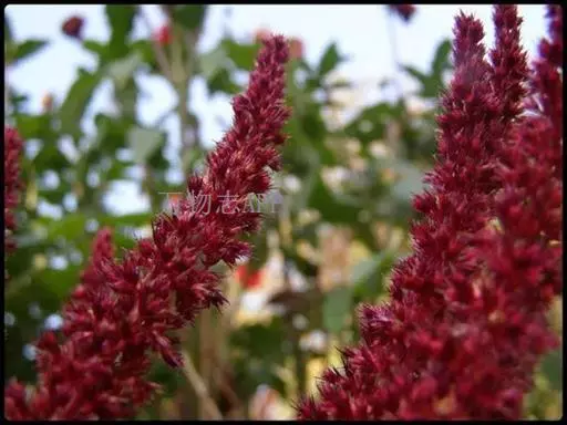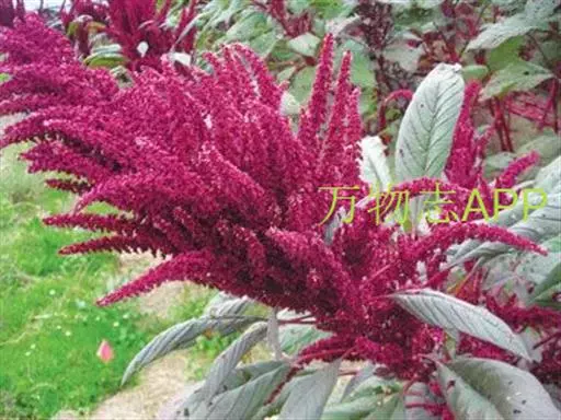 千穗谷(Amaranthus hypochondriacus L.)一年生草本;茎绿色或紫红色,分枝,无毛或上部微有柔毛。叶片菱状卵形或矩圆状披针形,具凸尖,基部楔形,无毛,上面常带紫色;叶柄无毛。圆锥花序顶生,直立,圆柱形,不分枝或分枝,由多数穗状花序形成,花簇在花序上排列极密;苞片绿色或紫红色,背部中脉隆起;花被片矩圆形,绿色或紫红色。胞果近菱状卵形,环状横裂,绿色,上部带紫色,超出宿存花被。种子近球形,白色,边缘锐。花期7-8月,果期8-9月。