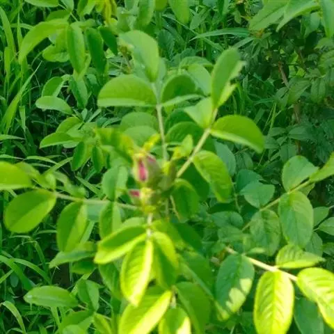 小果蔷薇攀援灌木,高2-5米;小枝圆柱形,无毛或稍有柔毛,有钩状皮刺。小叶3-5,稀7;连叶柄长5-10厘米;小叶片卵状披针形或椭圆形,稀长圆披针形,长2.5-6厘米,宽8- 25毫米,先端渐尖,基部近圆形,边缘有紧贴或尖锐细锯齿,两面均无毛,上面亮绿色,下面颜色较淡,中脉突起,沿脉有稀疏长柔毛;小叶柄和叶轴无毛或有柔毛,有稀疏皮刺和腺毛;托叶膜质,离生,线形,早落。