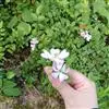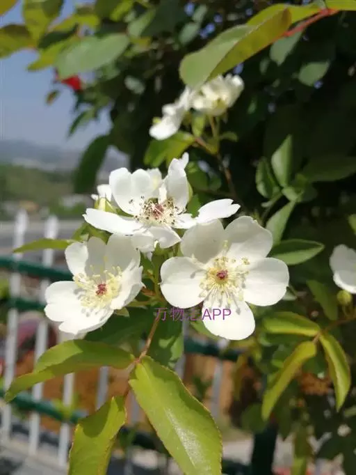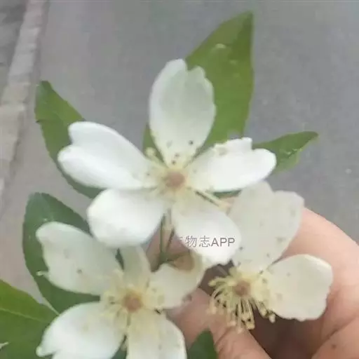 花多朵成复伞房花序;花直径2-2.5厘米,花梗长约1.5 厘米,幼时密被长柔毛,老时逐渐脱落近于无毛;萼片卵形,先端渐尖,常有羽状裂片,外面近无毛,稀有刺毛,内面被稀疏白色绒毛,沿边缘较密;花瓣白色,倒卵形,先端凹,基部楔形;花柱离生,稍伸出花托口外,与雄蕊近等长,密被白色柔毛。