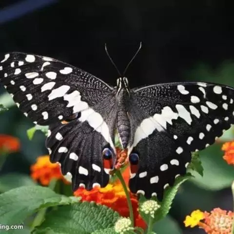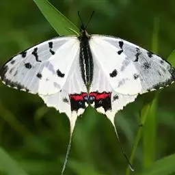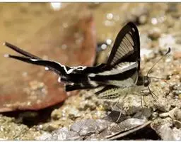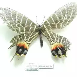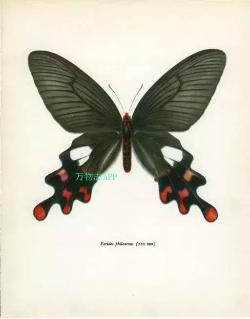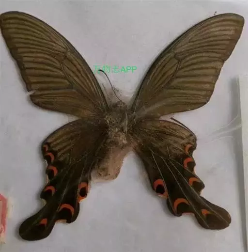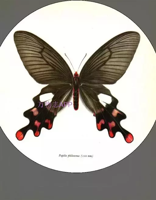 形态 成虫:翅展80—90 mm。翅黑色,脉纹两侧灰白色或黄褐色。两翅中室及前翅翅脉间有黑色条纹。后翅窄,向末端加宽,中室外有1列4—5个大白斑,外缘有5个红斑,尾突上有1个略呈圆形的红斑。翅反面与正面相似。