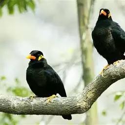 黑冠椋鸟:中等体型的椋鸟,体长21厘米。雄鸟前头为黑色并具金属光泽;头顶、颈项和羽冠亦为黑色;翅及翅上覆羽黑色;尾羽褐色,具白色端斑;上体灰色;下体淡黄褐色。雌鸟形态与雄鸟相似,但羽冠较雄鸟为短。虹膜蓝白或乳黄色;嘴峰铅绿色;跗蹠及爪柠檬黄色。头具黑色羽冠,与其他椋鸟易于区别。主要栖息于开阔落叶阔叶林和灌木林中以及多营巢于树洞中或其他洞穴内。属群鸟共栖。常4-8只结小群活动。鸣声清脆响亮。食物有果实和浆果,偶食花蜜和小型昆虫。分布于印度、中国云南耿马。常见于印度城镇、村庄及铁路沿线。偶见于中国云南西南部和西藏东南部。