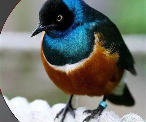 成鸟有黑色的头部,前胸、翅膀和尾巴极具光泽,整体有蓝色至绿色的背影。胸部蓝色,其次是白色的斑纹,下腹部是桔红色,尾下覆羽(羽毛)和翼衬白色。幼鸟的羽毛乏味,胸部下方的白色带界限不太明显。最初眼睛为棕色,然后变成灰白色、奶油色的眼睛,直到达到成年的着色。