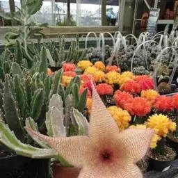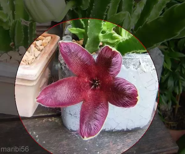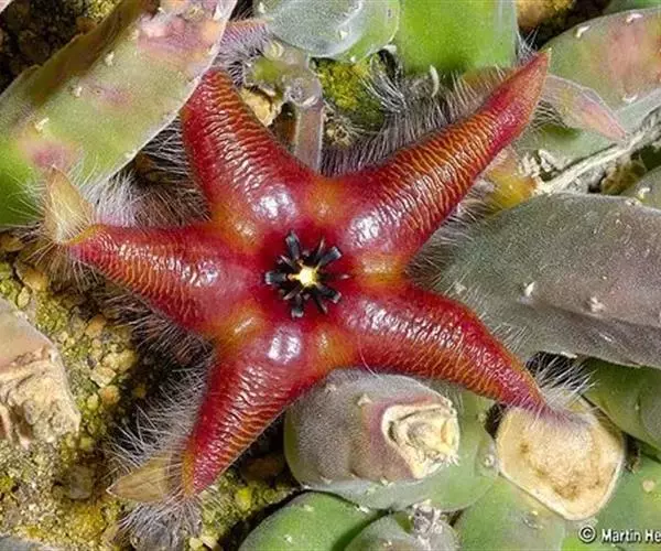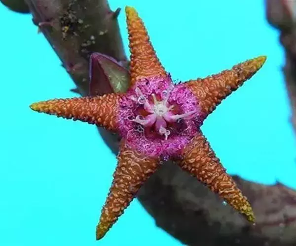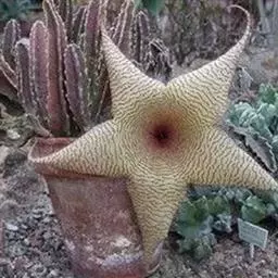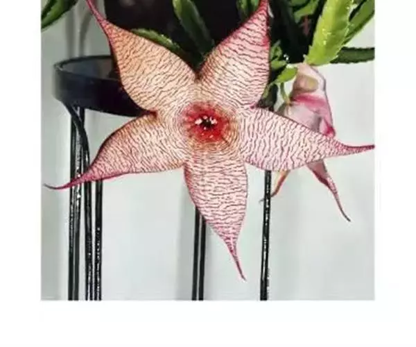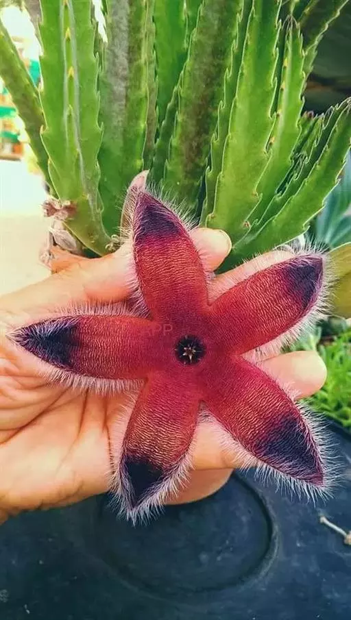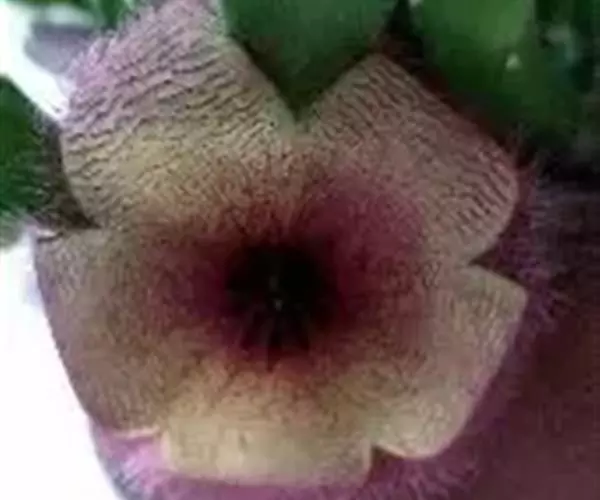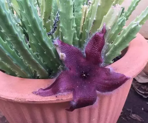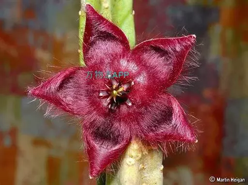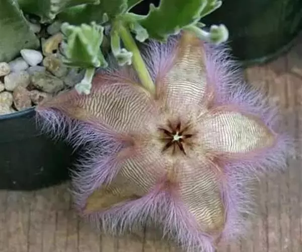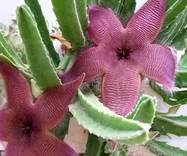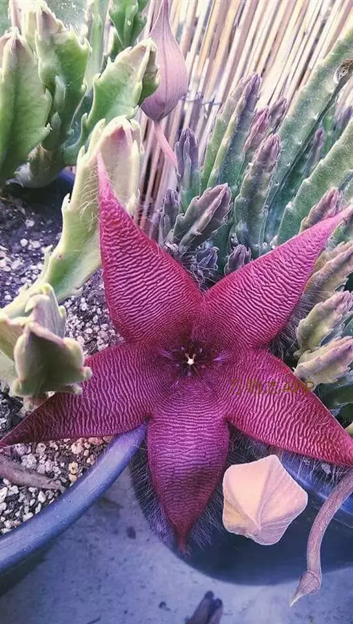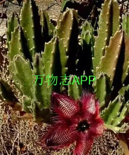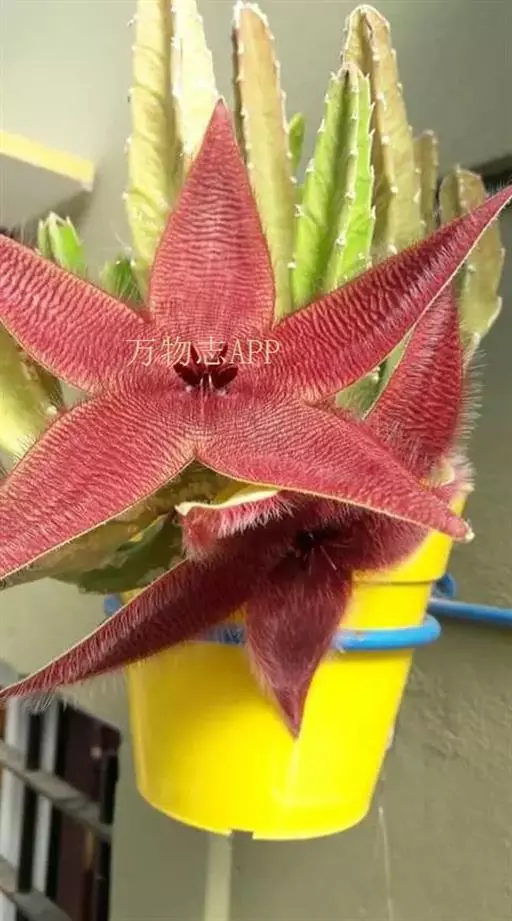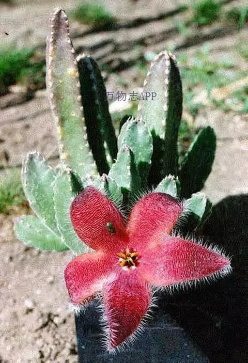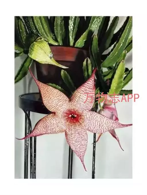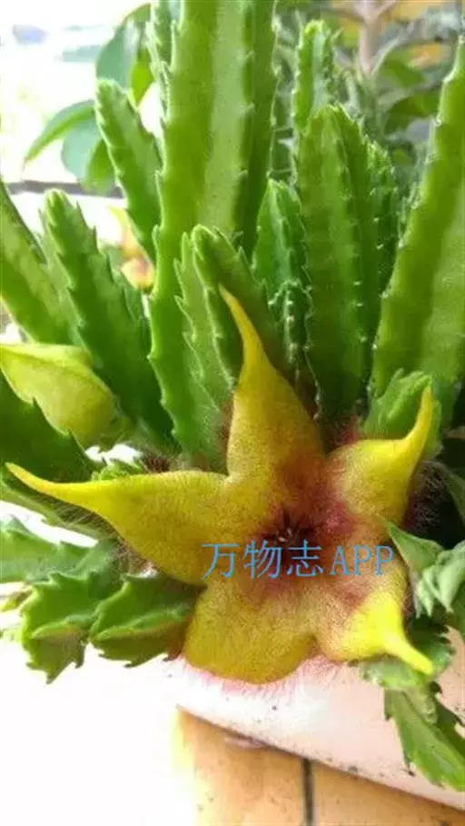 犀角(Stapelia luxurians Dammann ex Rust):其肉质茎青绿色,四棱柱形基部分枝群生,棱间下凹,具稀疏自钰聋状缘。花星形,直径10-12厘米紫红褐色,具淡黄色波状横纹,花瓣学被紫色毫毛。夏、秋季节开放。