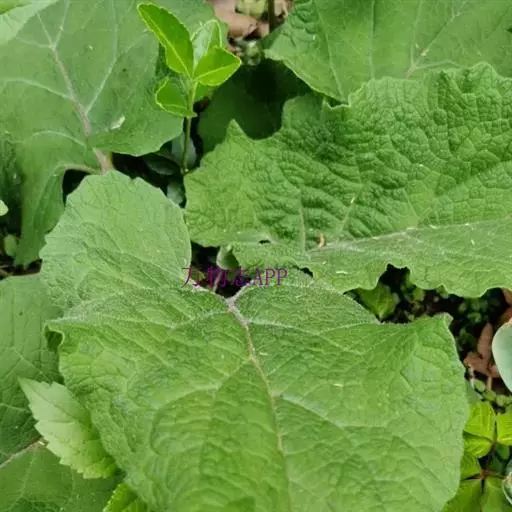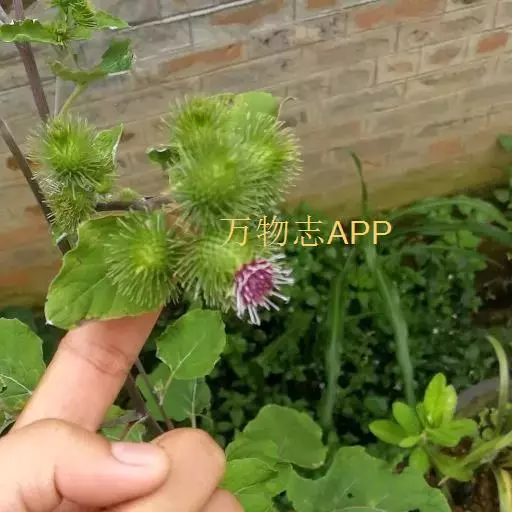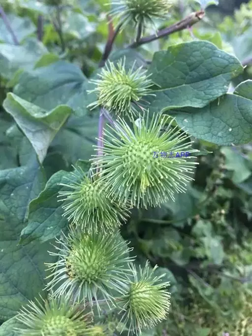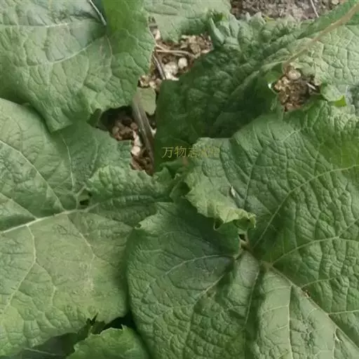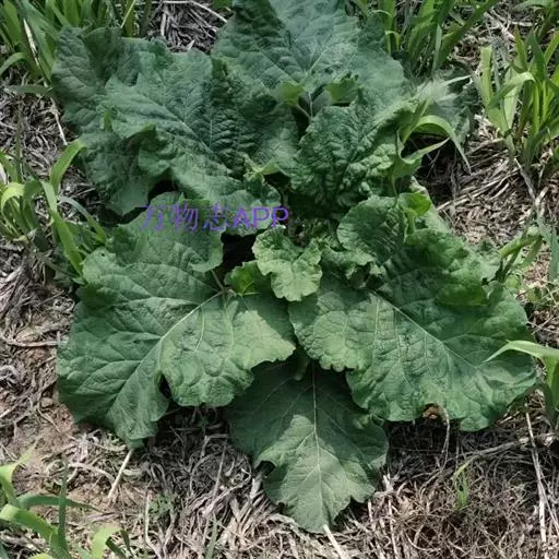 牛蒡 二年生草本,具粗大的肉质直根,长达15厘米,径可达2厘米,有分枝支根。茎直立,高达2米,粗壮,基部直径达2厘米,通常带紫红或淡紫红色,有多数高起的条棱,分枝斜升,多数,全部茎枝被稀疏的乳突状短毛及长蛛丝毛并混杂以棕黄色的小腺点。
