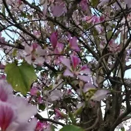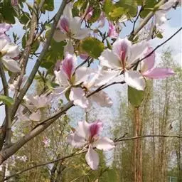 洋紫荆:落叶乔木;树皮暗褐色,近光滑;幼嫩部分常被灰色短柔毛;枝广展,硬而稍呈之字曲折,无毛。叶近…