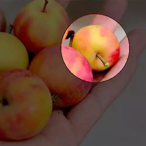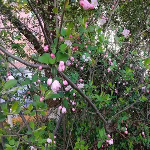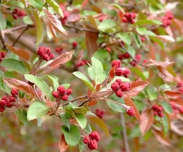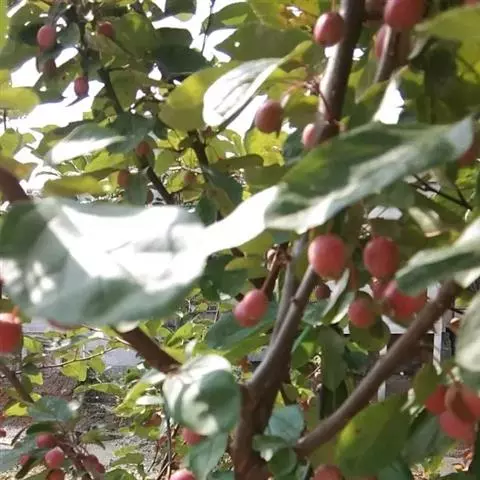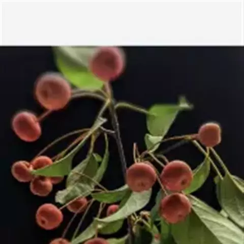落叶小乔木,树势强,树姿直立,株高4.5-6米,冠幅6米,树形圆而紧凑,树干棕红色,皮孔大而多。树皮纵裂,多刺状短枝,枝条斜出,小枝紫红色,老枝红褐色。嫩叶紫红色,逐渐变为翠绿色;叶卵圆形至椭圆形,先端短尖,基部圆形或宽楔形,边缘具钝锯齿。单瓣花,直径4-4.5厘米,总状伞形花序,花期4月中下旬,花蕾深紫红,花深粉红色,杯状,5-6朵簇生于枝顶,花开繁密而艳丽,花径约1.2厘米,花梗紫红色,密被柔毛,半直立。果期6-10月,果锥形,橘黄或枯红色,结果量大,果顶尖,萼片宿存直立,挂果期可长达数月,直到隆冬。