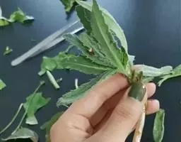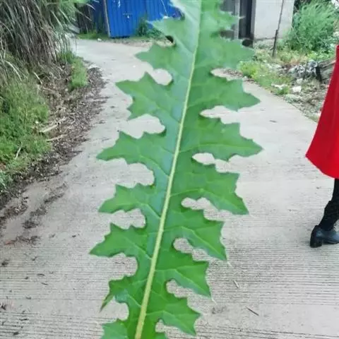 中部茎叶全形披针形、倒披针形或线状披针形,长10-15厘米,宽4-5厘米,羽状深裂,基部沿茎下延成茎翼;侧裂片3-4对,等大或不等大二叉裂,叉裂长三角形或披针形,顶端急尖成长针刺,裂缘有缘毛状短针刺;顶裂片披针形,边缘有少数长针刺及多数的缘毛状短针刺。全部长针刺长5-10毫米;向上的叶渐小,与中部茎叶同形并等样分裂,接头状花序下部的叶线形,裂片边缘长针刺化。全部叶质地薄,叶质,两面异色,上面绿色或黄绿色,被稠密的贴伏的针刺,针刺长1.5毫米,下面灰白色,被稠密或密厚的绒毛。