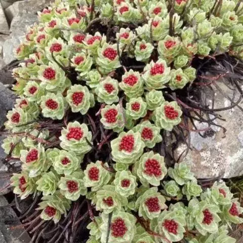 高山红景天〔学名:Rhodiola cretinii (Hamet)H. Ohba subsp. sino-alpina (Frod.))H. Ohba〕景天科:红景天属多年生草本植物,高达5厘米。根颈细,叶互生,花茎全部疏生,花序顶生,雌株有花,聚伞状着生。花常为四基数;雌花淡绿色或白色,8月初开花。7-8月结果,