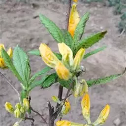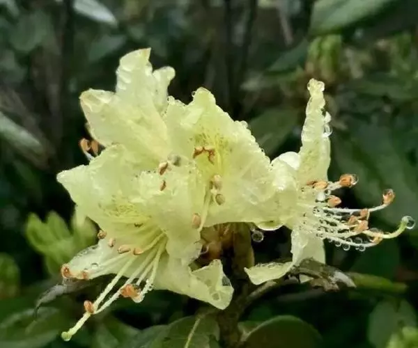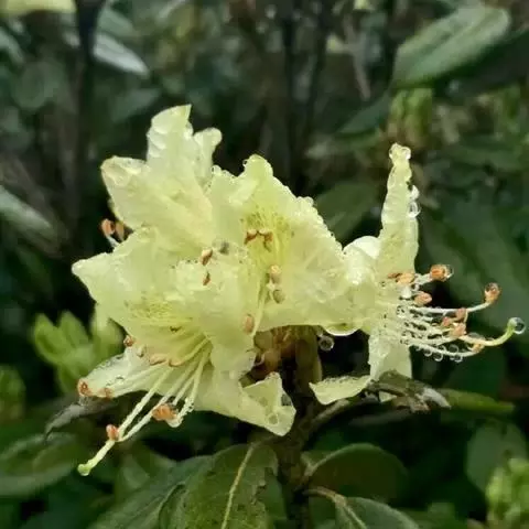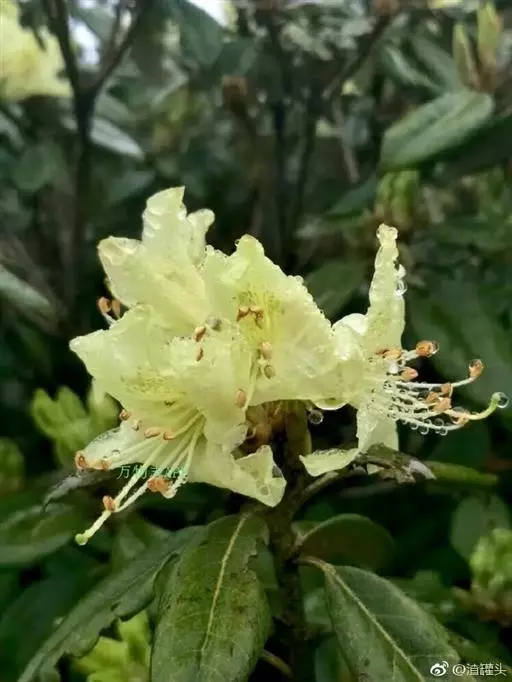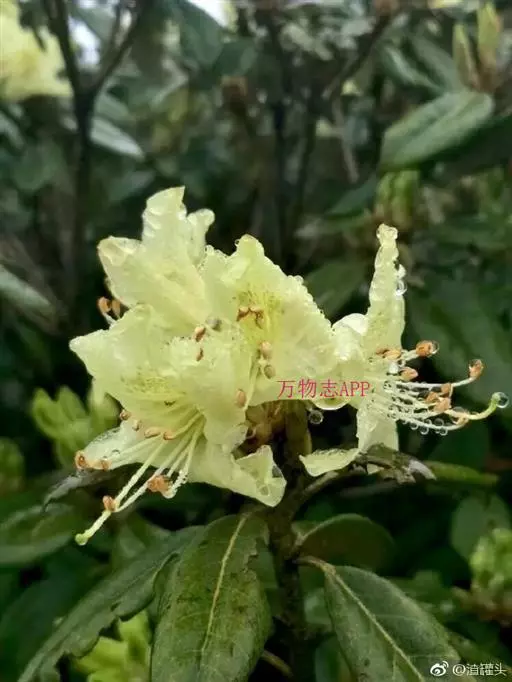 问客杜鹃(学名:Rhododendron ambiguum Hemsl. ):灌木,高1-3米。幼枝细长,密被腺体状鳞片。叶革质,椭圆形,卵状披针形或长圆形,上面被鳞片,幼叶中脉被毛或无毛,下面灰绿色。花序顶生,3-4花,伞形着生或短总状;花萼长环状或波状浅裂;花冠黄色、淡黄色或淡绿黄色,内面有黄绿色斑点和微柔毛,宽漏斗状,略两侧对称;雄蕊不等长,花丝下部密被短柔毛;子房5室,花柱细长,伸出花冠外。蒴果长圆形。花期5-6月,果期9-10月。