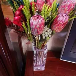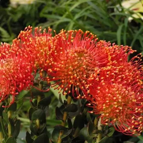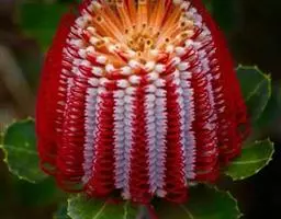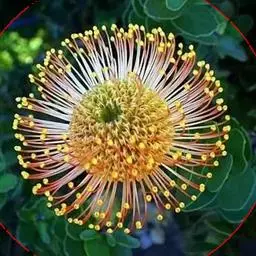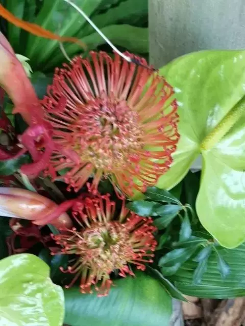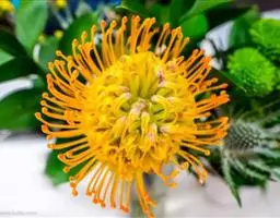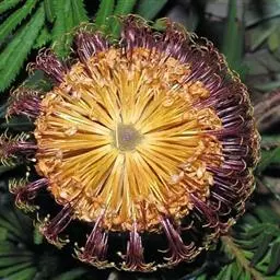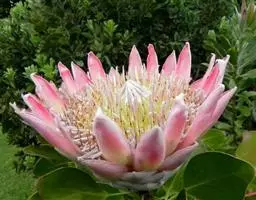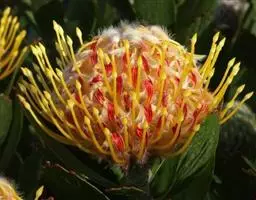 帝王花,山龙眼科帝王花属多年生常绿灌木植;茎干粗壮,叶色翠绿光亮;花朵呈圆球状;其苞片有的完全打开,…