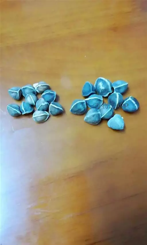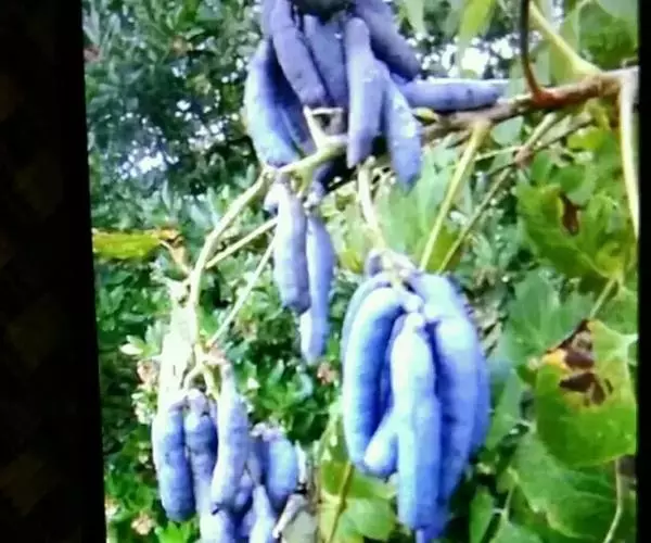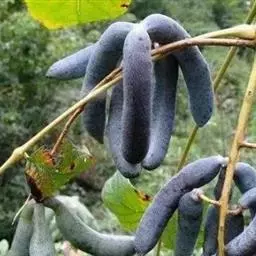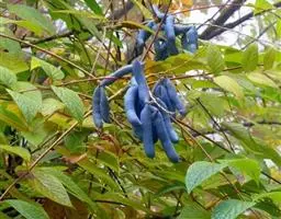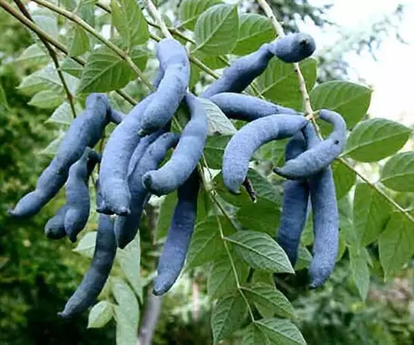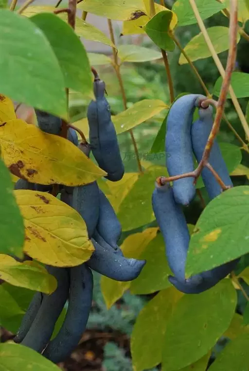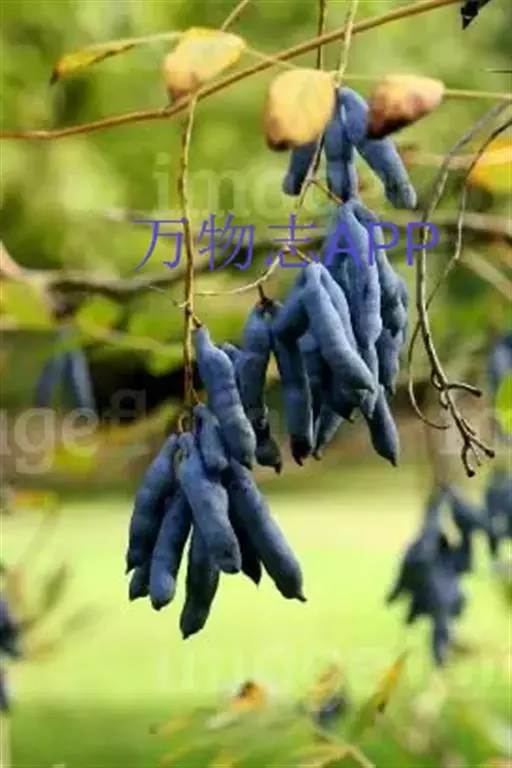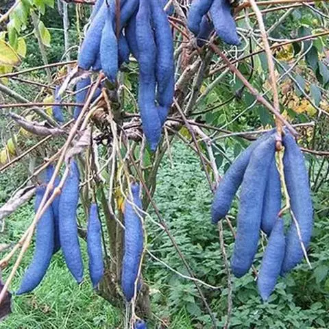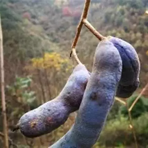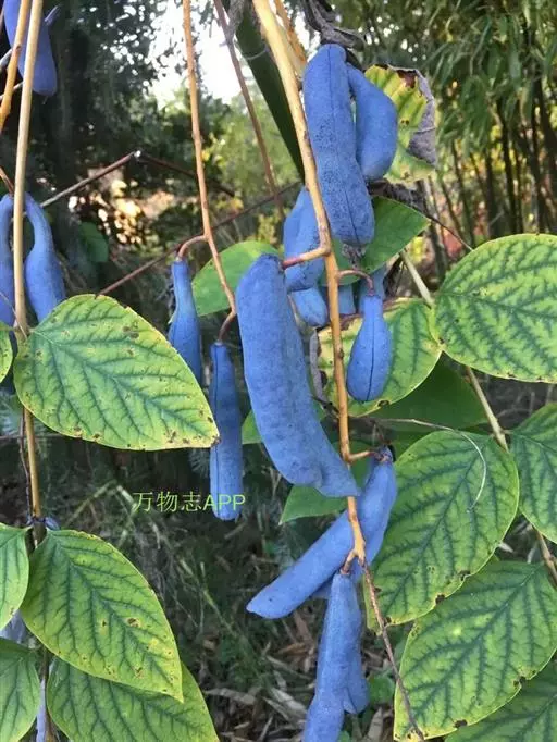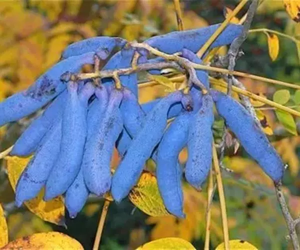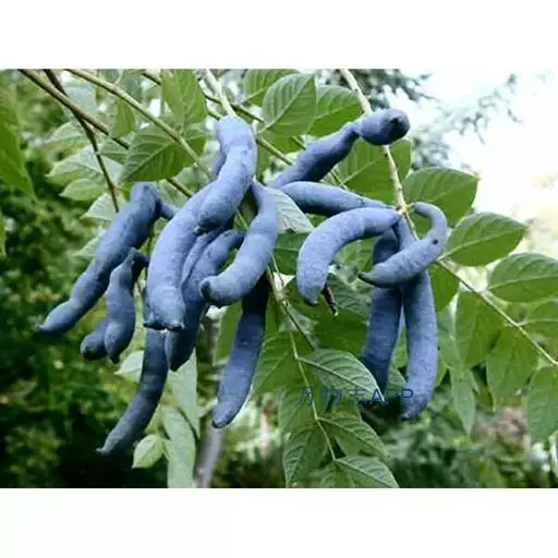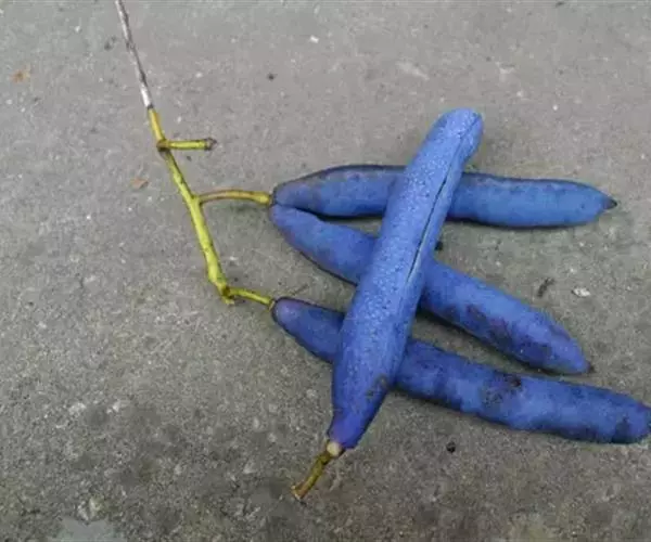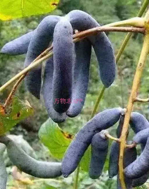 果下垂,圆柱形,蓝色,长5-10厘米,直径约2厘米,顶端截平但腹缝先端延伸为圆锥形凸头,具小疣凸,果皮表面有环状缢纹或无;种子倒卵形,黑色,扁平,长约1厘米。花期4-6月,果期7-8月。