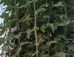 症状表现:由于铁在杨树体内不易移动,当栽植的杨树表现缺铁时,杨树顶端新梢嫩叶的叶脉间率先开始失绿,并由叶尖逐渐向叶片基部变黄,而叶脉仍保持绿色,杨树的生长速度明显下降,若不及时通过外源补充可被杨树利用的铁元素,严重时整个新叶片均会变成黄色,叶脉也逐步变黄,最后几乎变成白色,杨树生长显得十分缓慢;一旦缺铁非常严重时,树冠中下部老叶也出现叶脉间黄化的症状,叶缘、叶尖枯焦及坏死,若持续发展下去,则造成杨树叶片脱落,生长停滞而死亡。