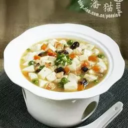 豆腐为补益清热养生食品,常食之,可补中益气、清热润燥、生津止渴、清洁肠胃。更适于热性体质、口臭口渴、肠胃不清、热病后调养者食用。现代医学证实,豆腐除有增加营养、帮助消化、增进食欲的功能外,对齿、骨骼的生长发育也颇为有益,在造血功能中可增加血液中铁的含量;豆腐不含胆固醇,为高血压、高血脂、高胆固醇症及动脉硬化、冠心病患者的药膳佳肴。也是儿童、病弱者及老年人补充营养的食疗佳品。豆腐含有丰富的植物雌激素,对防治骨质疏松症有良好的作用。还有抑制乳腺癌、前列腺癌及血癌的功能,豆腐中的甾固醇、豆甾醇,均是抑癌的有效成分。