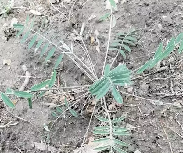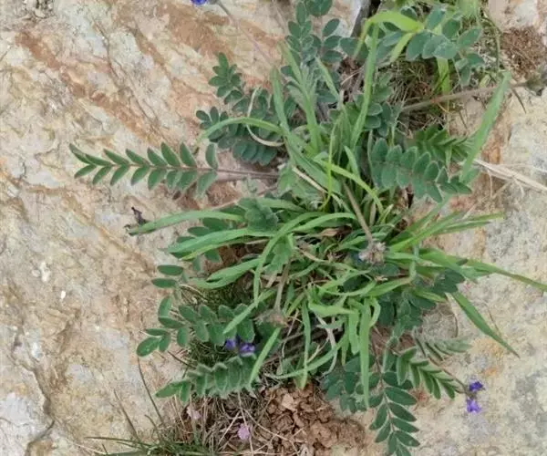 多年生草本,主根圆锥状。分茎极缩短,叶及总花梗于分茎上丛生。托叶宿存,下面的阔三角形,上面的狭三角形,基部合生,外面密被白色长柔毛;叶在早春时长仅2-5厘米,夏秋间可长达15厘米,个别甚至可达23厘米,早生叶被长柔毛,后生叶毛稀疏,甚几至无毛;叶柄具沟;小叶7-21片,椭圆形到长圆形,卵形到长卵形,有时披针形,顶端小叶有时为倒卵形,长 (4.5) 10-14 (-25) 毫米,宽 (1.5) 5-8 (-10) 毫米,基部圆,先端具细尖,急尖、钝、微缺或下凹成弧形。伞形花序有2-6朵花;总花梗具沟,被长柔毛,花期较叶稍长,花后约与叶等长或短于叶长;苞片三角状线形,长2-4毫米,花梗长1-3.5毫米;花萼钟状,长7-8毫米,被贴伏长柔毛,上2萼齿最大,与萼筒等长,下3萼齿较小,最下一片最小;花冠紫堇色,旗瓣长13毫米,宽8毫米,倒卵形,全缘,先端微缺,基部渐狭成瓣柄,翼瓣长10毫米,宽3毫米,斜长倒卵形,具短耳,瓣柄长3毫米,龙骨瓣长6毫米,宽2毫米,倒卵形,瓣柄长2.5毫米;子房椭圆状,密被贴服长柔毛,花柱无毛,内卷,顶端膨大成圆形柱头。荚果圆筒状,长17-22毫米,直径3-4毫米,被长柔毛;种子三角状肾形,直径约1.8毫米,具凹点。花期4月。果期5-6月。