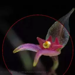 花瓣质地较薄,白色,近卵形或椭圆形,长1-2毫米,中部宽1-1.5毫米,先端稍钝,具1条脉,有时3条,但仅中肋到达先端;唇瓣橘红色,肉质,舌形,稍向外下弯,基部具短爪并且与蕊柱足末端连接,先端钝,边缘具细乳突或白色腺毛,上面具2条密生细乳突的龙骨脊;蕊柱粗短,长约1毫米;蕊柱齿短钝,呈三角形或牙齿状,与药帽近等高,长约0.2毫米,先端稍锐尖;蕊柱足橘红色,长约1毫米,其分离部分长约0.5毫米;药帽近半球形或心形,前端稍收窄,先端下弯,上面被细乳突。花期4-8月。