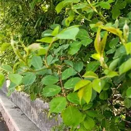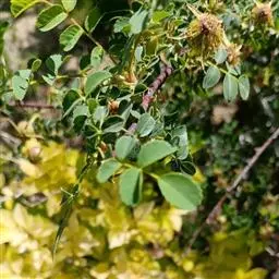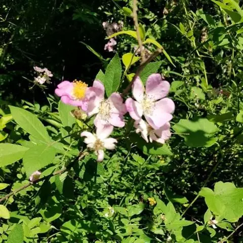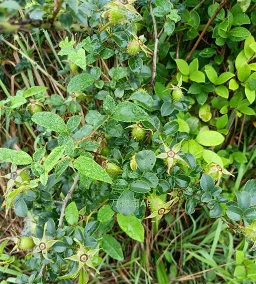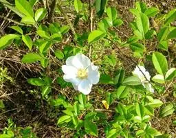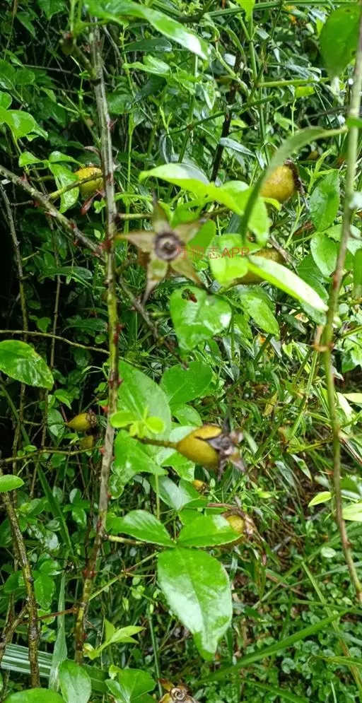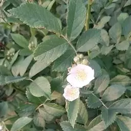 金樱子(学名:Rosa laevigata Michx.):常绿攀援灌木,高可达5米;小枝粗壮,散生扁弯皮刺,无毛。小叶革质,通常3,稀5;小叶片椭圆状卵形、倒卵形或披针状卵形,边缘有锐锯齿,上面亮绿色,无毛,下面黄绿色;托叶离生或基部与叶柄合生,披针形,边缘有细齿。花单生于叶腋,直径5-7厘米;花瓣白色,宽倒卵形,先端微凹;果梨形、倒卵形,稀近球形,紫褐色,外面密被刺毛。花期4-6月,果期7-11月。