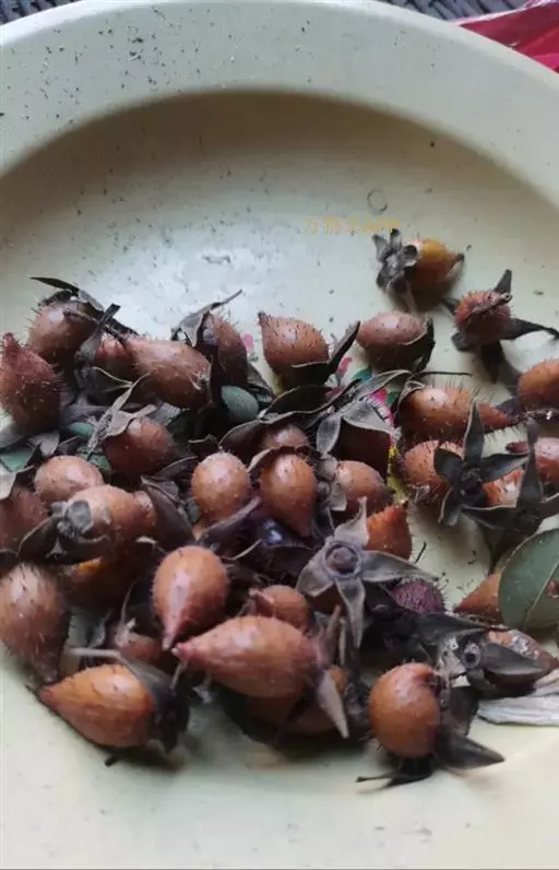 果梨形、倒卵形,稀近球形,紫褐色,外面密被刺毛,果梗长约3厘米,萼片宿存。花期4-6月,果期7-11月。