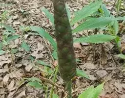 总花梗长达25厘米;穗状花序球果状,长4-5厘米;苞片卵形,长约2.5厘米,淡绿色或边缘淡黄色,顶端有小尖头;花萼管长约1厘米;花冠黄绿色,管长2-2.5厘米,裂片披针形,长不及2厘米;唇瓣中央裂片长圆状倒卵形,短于花冠裂片,有紫色条纹及淡黄色斑点,侧裂片卵形,长约6毫米;雄蕊暗紫色,花药长约9毫米;药隔附属体钻状,长约7毫米。