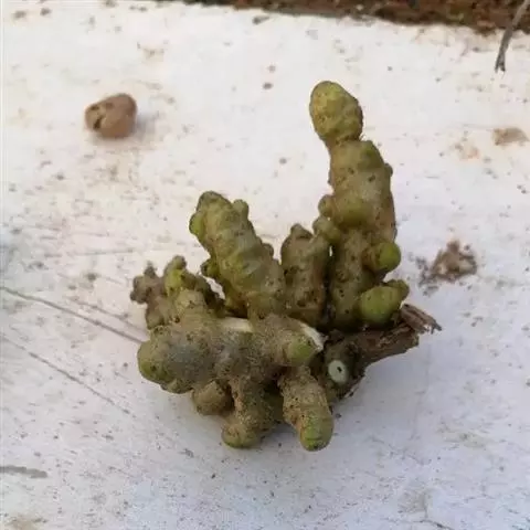 ⑶种姜的采收,一般掌握在地上植株具有4-5片叶片时,大约在6月中下旬进行。采收时小心将植株根际的土壤拨开,取出种姜后再覆土掩盖根部。若采收过迟伤根重影响植株生长。