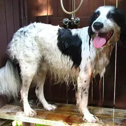 比较长,尖端略细,延伸到离地面1.5英寸的地方,或低于飞节1.5英寸。当他静止时,笔直下垂或略微弯曲,运动时或兴奋时,尾巴卷曲,但不能举过背部。覆盖有大量毛发,毛发浓厚而呈刚毛质地,下半部分毛发略长,而末端略有刘海不属于缺陷。卷曲或环状尾巴属于缺陷