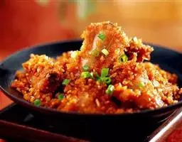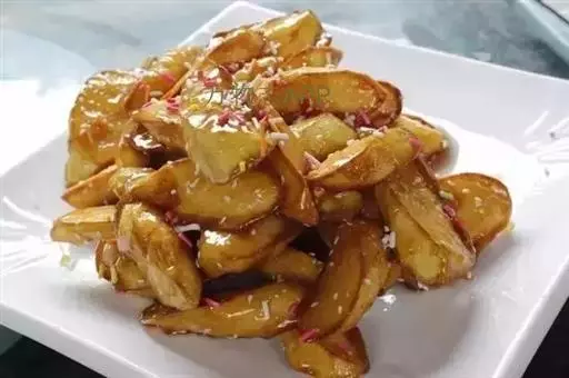 (3)勺刷净加清水、白糖,用慢火熬糖,从水大泡变成水小泡;从糖大泡变成糖小泡至浓稠变色时,倒入炸好的地瓜离勺、颠勺,使糖液完全沾在地瓜上;倒入抹过香油的盘内,上桌的时候要上碗白水,沾着吃,才不沾牙。