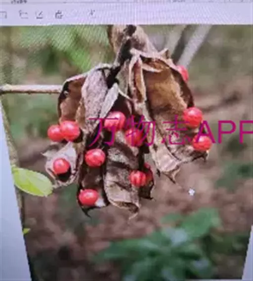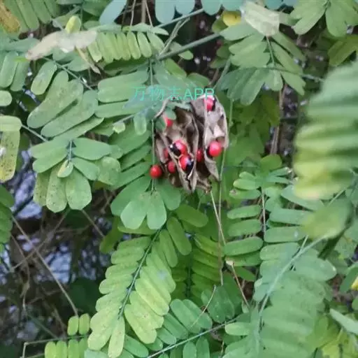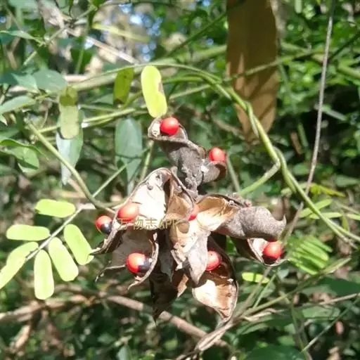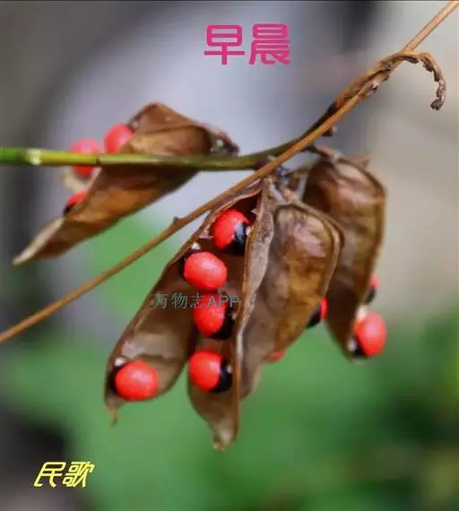 荚果长圆形,果瓣革质,长2-3.5厘米,宽0.5-1.5厘米,成熟时开裂,有种子2-6粒;种子椭圆形,平滑具光泽,上部约三分之二为鲜红色,下部三分之一为黑色。花期3-6月,果期9-10月。