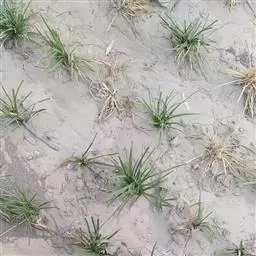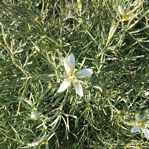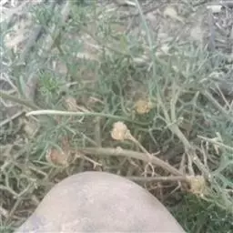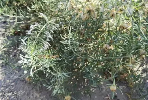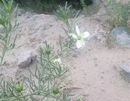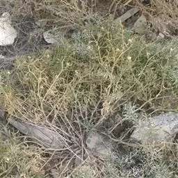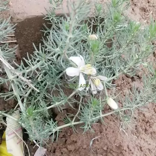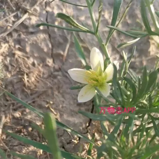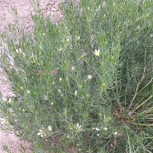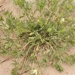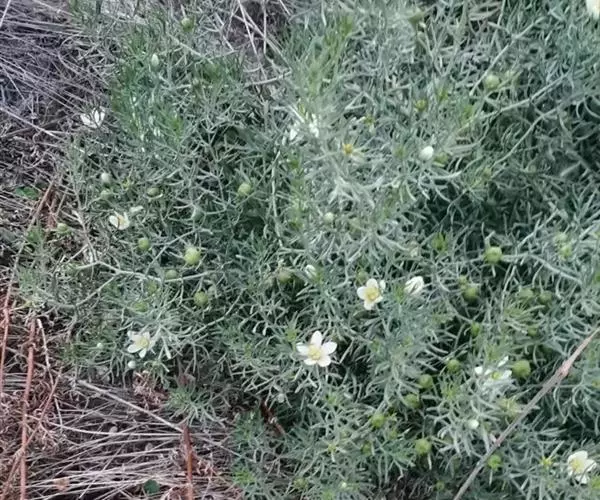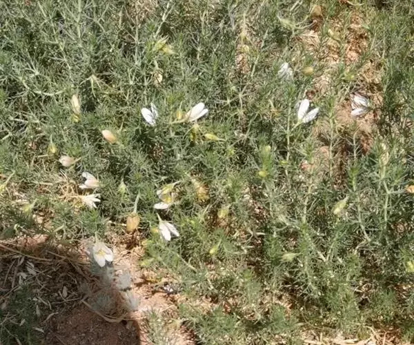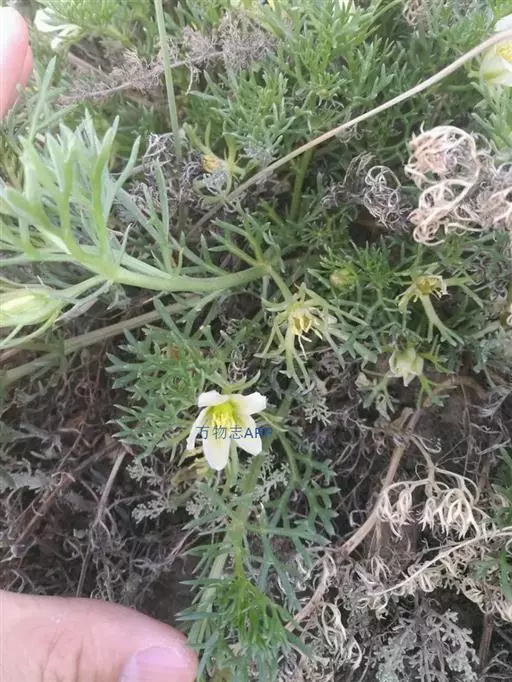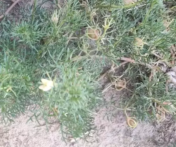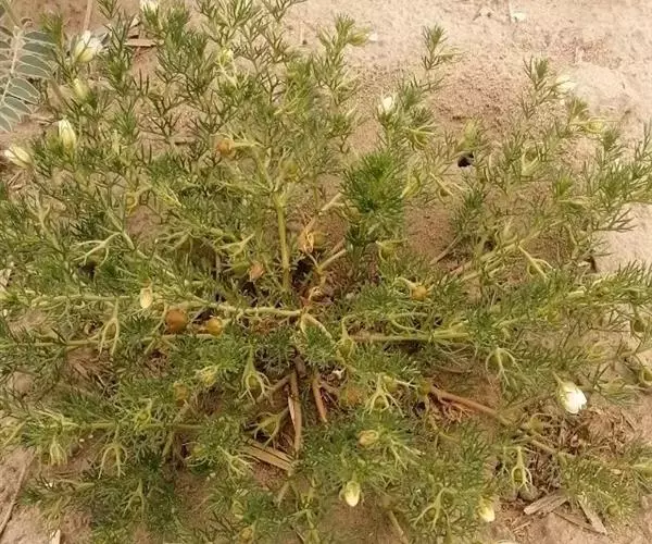 植物-骆驼蓬(图1) 多年生草本,高30-70厘米,无毛。根多数,粗达2厘米。茎直立或开展,由基部多分枝。叶互生,卵形,全裂为3-5条形或披针状条形裂片,裂片长1-3.5厘米,宽1.5-3毫米。花单生枝端,与叶对生;萼片5,裂片条形,长1.5-2厘米,有时仅顶端分裂;花瓣黄白色,倒卵状矩圆形,长1.5-2厘米,宽6-9毫米;雄蕊15,花丝近基部宽展;子房3室,花柱3。蒴果近球形,种子三棱形,稍弯,黑褐色、表面被小瘤状突起。骆驼蓬5月上旬返青,7~8月开花,9~10月种子成熟。