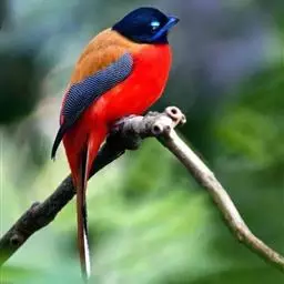 红头咬鹃: 体大,体长约33厘米,体重75-110克。头、颈暗绯红色;背、肩锈褐色。两翅黑色,…